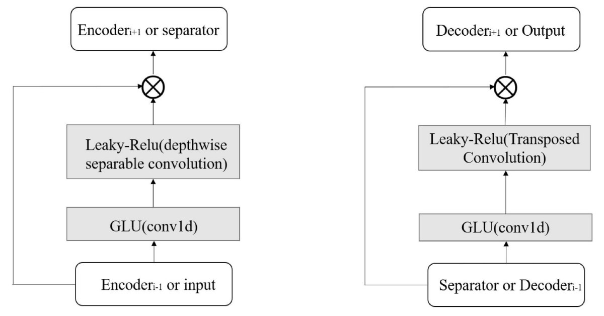 - 1D convolution, GLU activation, depthwise separable convolution, Leaky-ReLU activation으로 구성