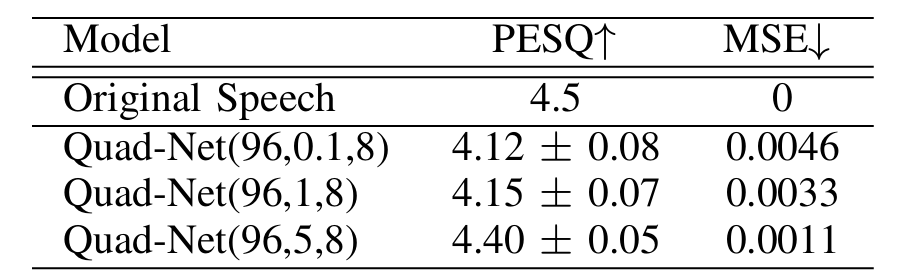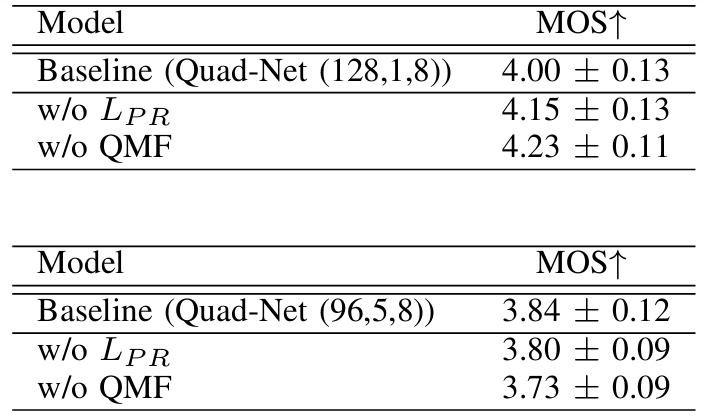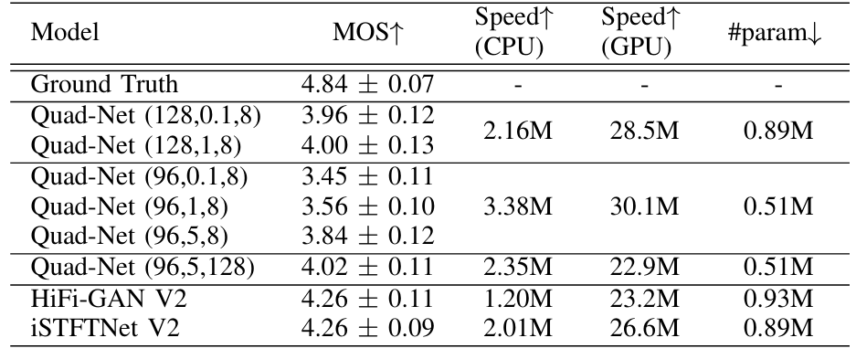 - Quad-Net은 기존보다 빠른 inference speed와 안정적인 MOS를 달성할 수 있음
