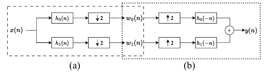 - 아래 (a)에서 2-channel Perfect Reconstruction Filter Bank (PRFB)의 analysis filter bank는 input signal을 2-channel signal로 decompose 한 다음, downsampling을 수행함