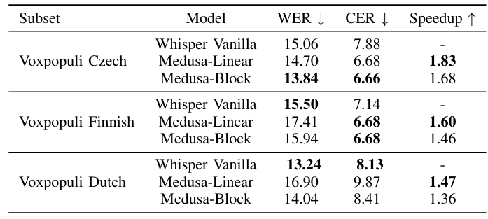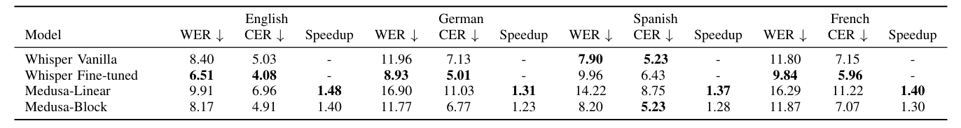 - Whisper-Medusa는 최대 1.48배의 speed up이 가능함