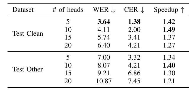- Head 수가 많아질수록 Whisper-Medusa 성능은 저하됨