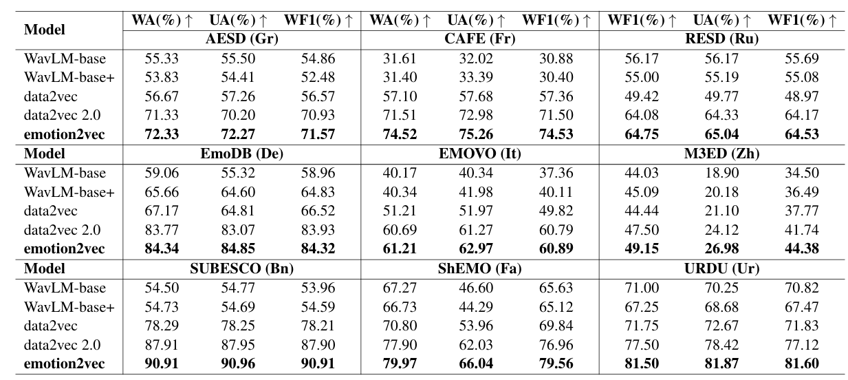 - English가 아닌 다른 language에 대해서도 Emotion2Vec의 성능이 가장 뛰어남