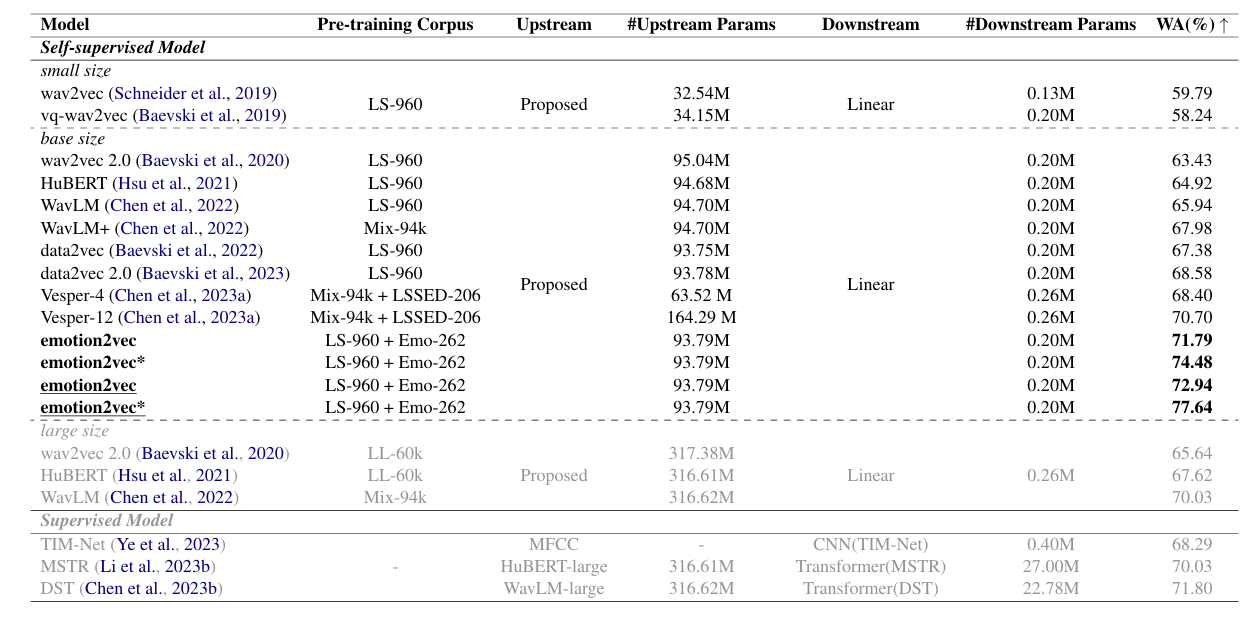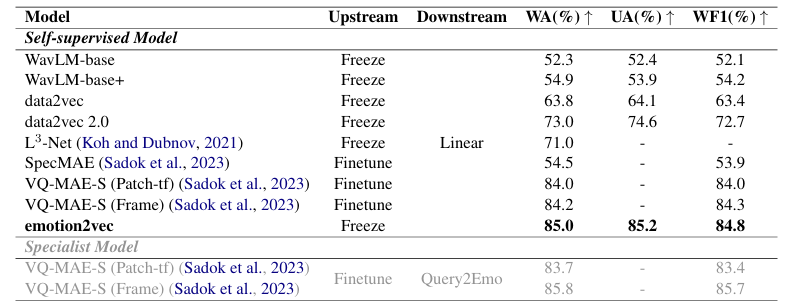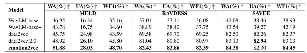 - Emotion2Vec은 추가적인 fine-tuning 없이도 최고의 성능을 달성함