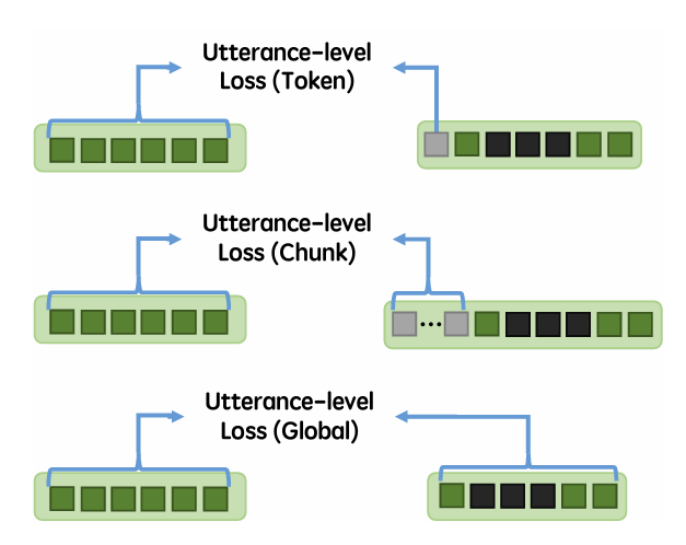 - 즉, utterance-level loss $\mathcal{L}_{Utt}$는 $Y^{\mathcal{T}},U^{\mathcal{S}}$의 temporal pooling result에 의해 compute 됨 - 한편으로 Utterance-level loss는 다음의 3가지 방식으로 compute 될 수 있음: