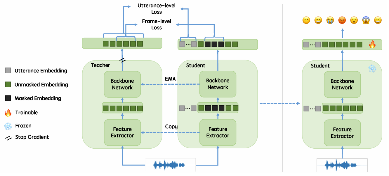- 262 hours의 open-source emotion data를 기반으로 Online Distillation paradigm을 적용하여 self-supervised pre-training을 수행