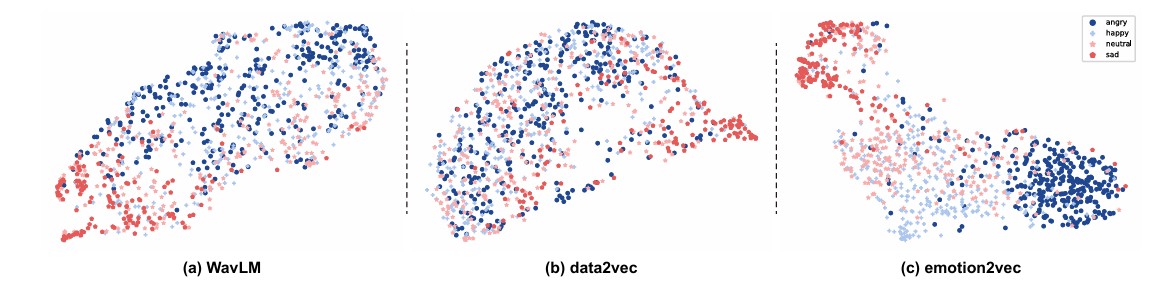 - 반면 (c) Emotion2Vec의 경우 high, low arousal representation이 cluster 되어 나타남