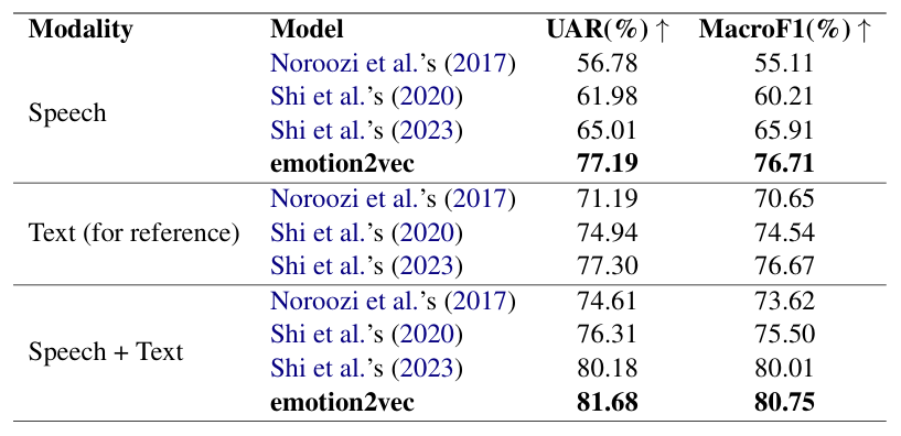 - 전체적으로 Emotion2Vec의 성능이 가장 뛰어남