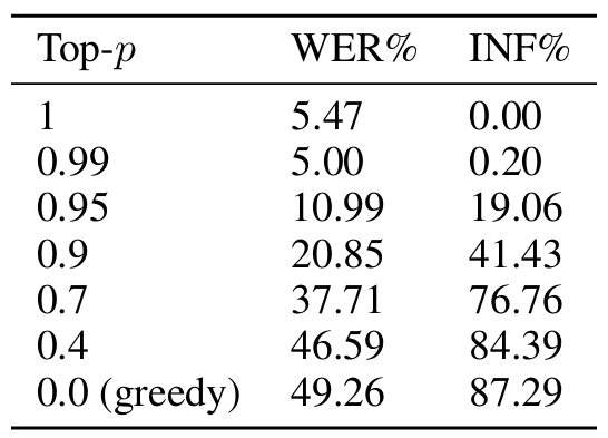 - 실제로 아래 표와 같이 VALL-E sample의 Word Error Rate (WER)와 Infinite Silence Probability (INF)를 비교해 보면, decoding strategy가 fully sampling에서 fully greedy로 shift 될수록 sample quality가 저하됨