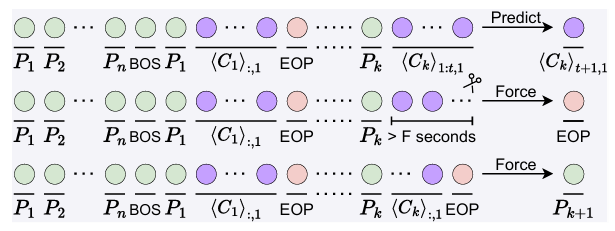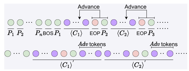 - $\langle \tilde{\mathbf{C}}_{i}\rangle$ : trailing $\text{EOP},\text{EOS}$ token과 broadcast 되는 $\langle \mathbf{C}_{i}\rangle$의 concatenation