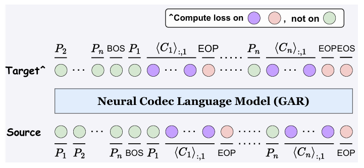 - ELLA-V는 hybrid sequence에서 continuation task를 수행하기 위해, GAR language model을 활용하여 discrete acoustic code sequence $\mathbf{C}_{:,1}$을 생성함