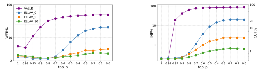 - 이 경우, VALL-E는 overfit silence token을 생성함 - ELLA-V의 경우 VALL-E에 비해 top-$p$ sampling strategy에 less sensitive 함