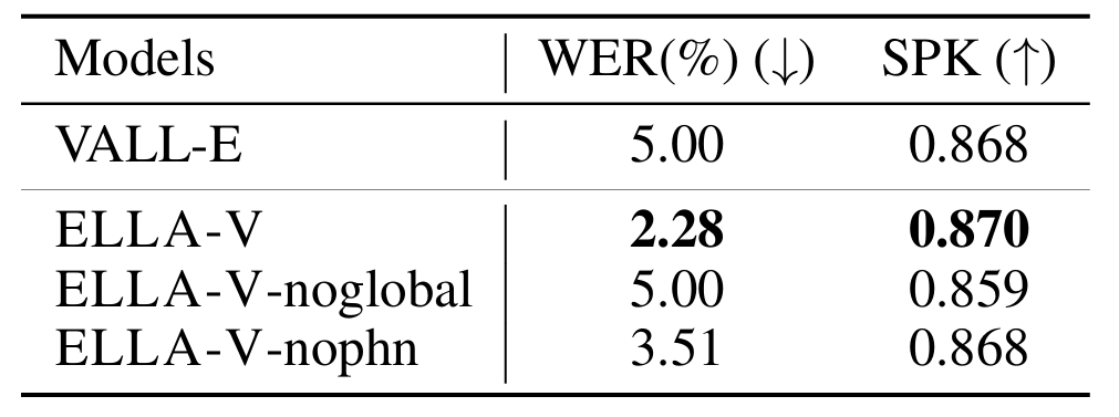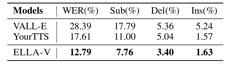 - 100개의 Hard synthesis case에 대해 ELLA-V는 가장 낮은 WER을 달성함