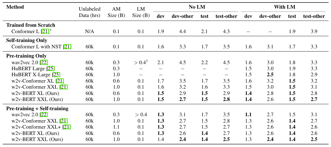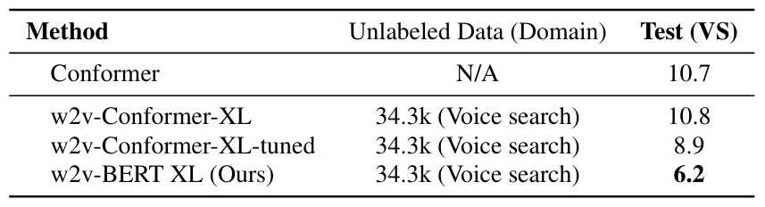 - Pre-trained W2V-BERT를 labeled data를 통해 fine-tuning 한 다음, LibriSpeech, Voice Search task에 적용함
