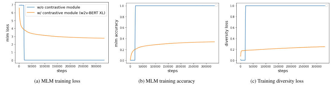 - 이때 해당 module은 useful representation을 학습하지 않고도 masked prediction task를 수행할 수 있음 - 실제로 아래 그림의 (a)와 같이 contrastive module이 없는 W2V-BERT의 masked prediction loss는 early stage에서 $0$으로 quickly decrease 함