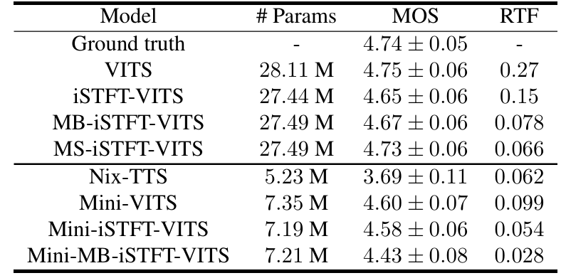 - MB-iSTFT-VITS는 기존 VITS 수준의 MOS를 유지하면서 $1.8\times$의 speed up을 달성함