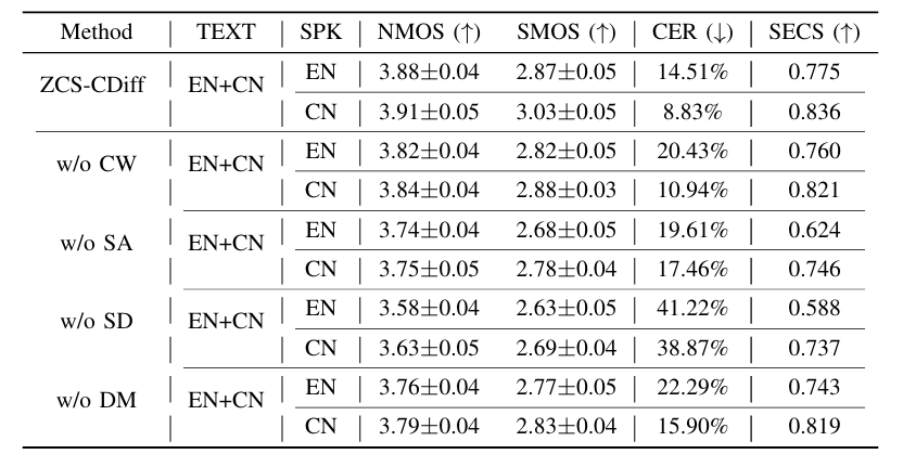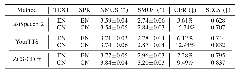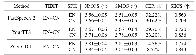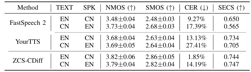 - Cross-lingual TTS 측면에서도 ZCS-CDiff는 가장 우수한 성능을 보임