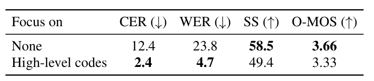 - 즉, high-level code가 final constructed frame에 더 많이 contribute 하고 speech content를 guide 하므로 early training stage에서 high-level code를 prioritize 함