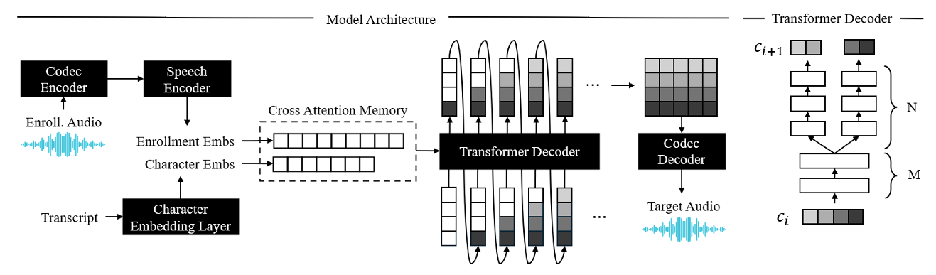 - 구조적으로는 audio codec, speech encoder, text embedding layer, Transformer decoder를 가짐
