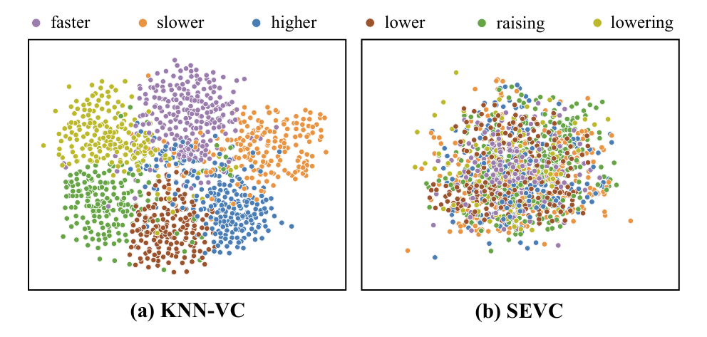 - $t$-SNE 측면에서 SEVC는 prosodic effect를 successfully disentangle 함