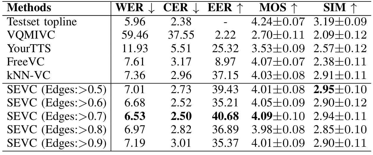 - 결과적으로 SEVC는 speech feature graph에서 unsupervised manner로 disentangled semantic cluster를 구성하여 irrelevant information leakage를 reduce 하고 converted speech의 intelligibility를 향상함