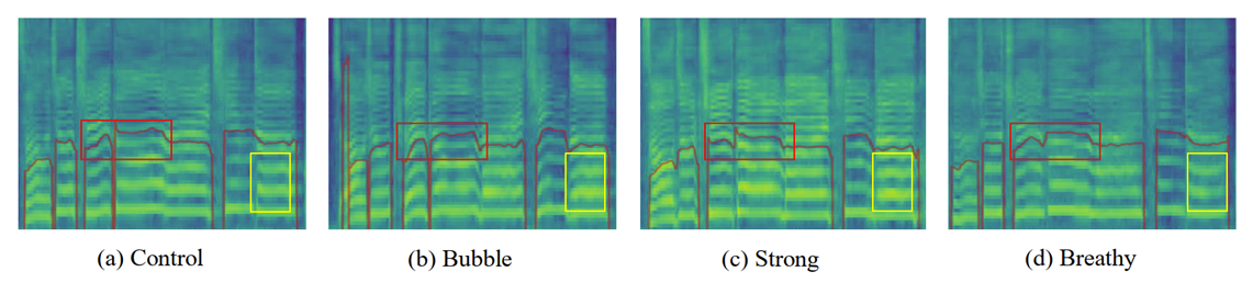- (b)는 bubble 적용 결과로써 cry-like tone을 반영하고, strong intensity인 (c)는 singing의 resonance와 intensity를 향상하고, breathy tone인 (d)는 breathy sound를 반영함