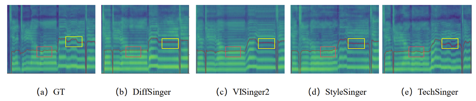 - Mel-spectrogram 측면에서 TechSinger의 $F0$는 다른 model과 비교하여 더 많은 detail, variation을 포함함
