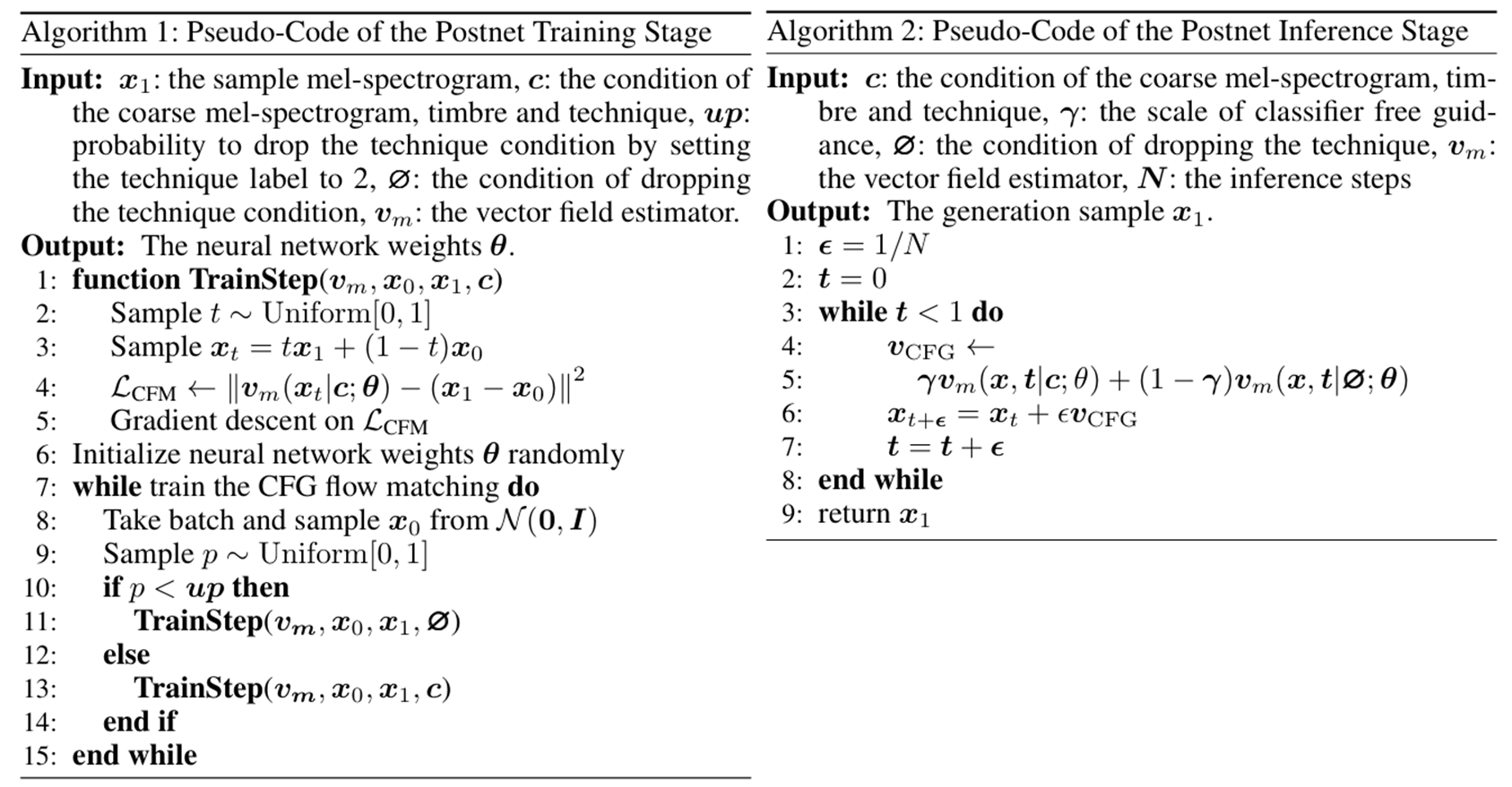 - Predicted $F0$, coarse mel-spectrogram, technique encoding의 adding feature $E_{m}$을 condition으로 하여 classifier-free flow matching postnet $\mathcal{L}_{mflow}$를 optimize 함 - 추론 시에는 input, prompt statement을 기반으로 technique sequence를 얻고, lyrics, note와 combine 하여 coarse mel-spectrogram을 얻음