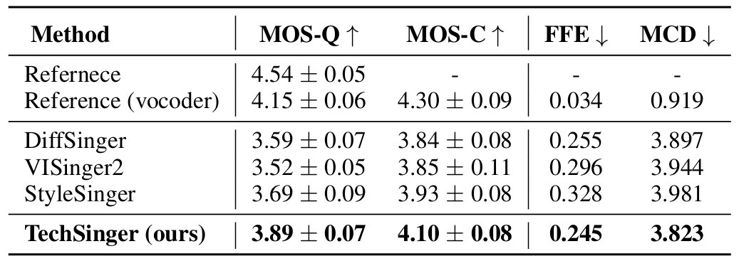 - 전체적으로 TechSinger의 성능이 가장 우수함