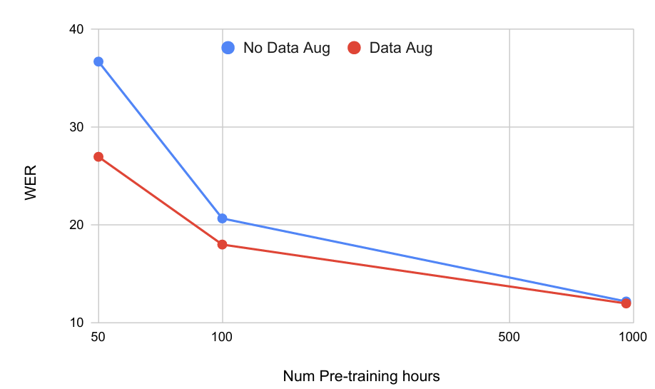 - 특히 pre-training data 양이 적은 경우 (50 hours) data augmentation을 적용했을 때 $11\%$의 WER 개선을 얻을 수 있음