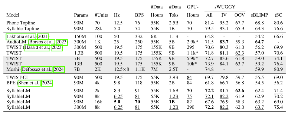 - 이때 unit tokenization은 SylBoost를 통해 수행되고, 나머지는 SyllableLM을 통해 수행됨