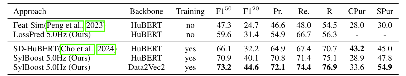 - Syllable boundary detection 측면에서 SylBoost가 가장 우수한 성능을 보임