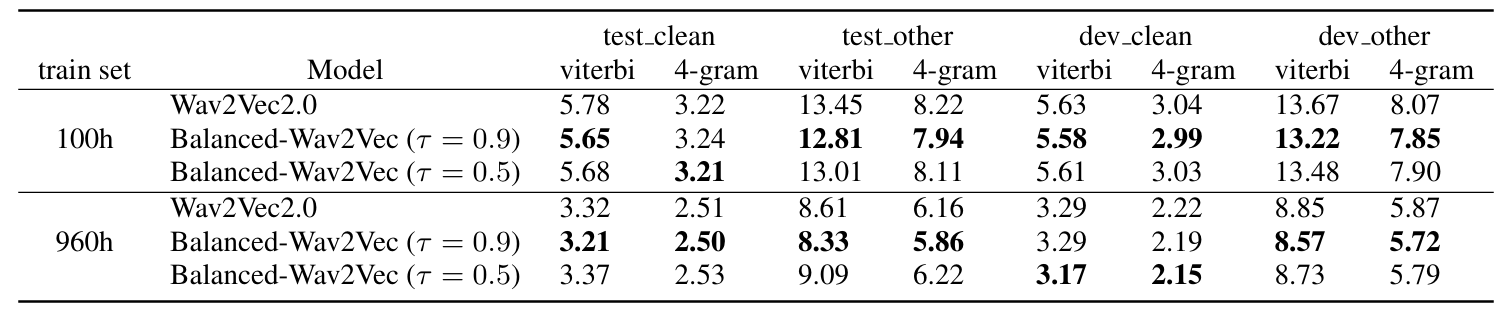 - In-domain dataset (LibriSpeech)에 대해 Balanced-Wav2Vec의 성능이 가장 우수함