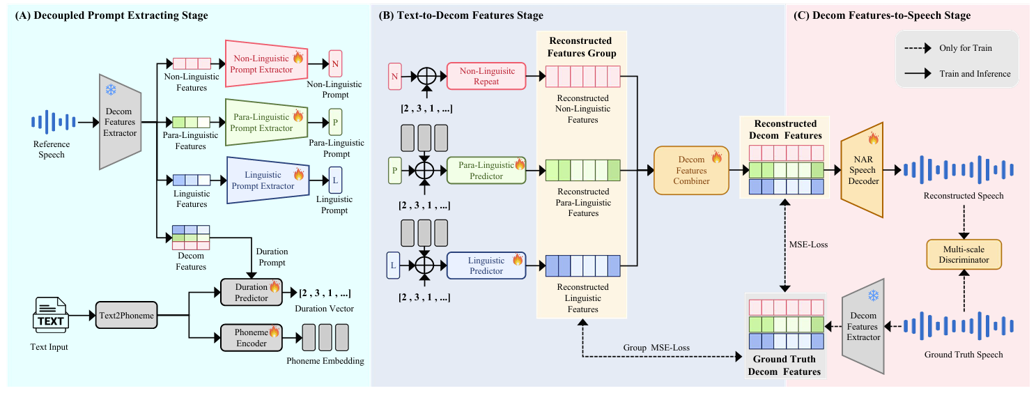 - 먼저 reference speech는 앞선 pre-trained Decom Feature extractor를 통해 linguistic, para-linguistic, non-linguistic feature에 대한 3가지 distinct prompt로 decouple 됨
