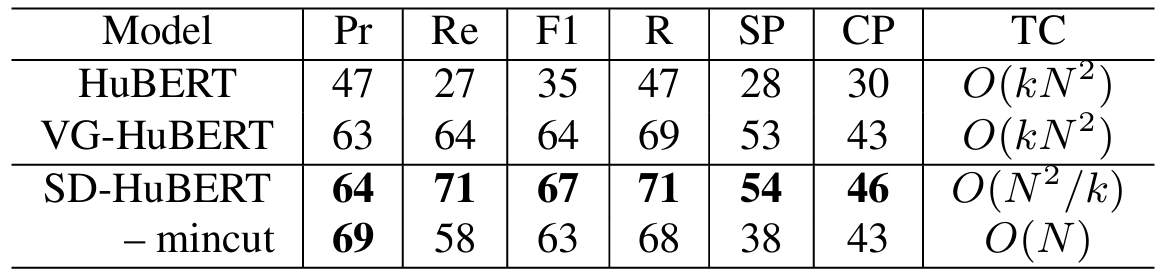 - 특히 SD-HuBERT의 behavior는 segementation의 free first cut을 제공하므로 minimum-cut algorithm의 search space를 크게 줄여줌
