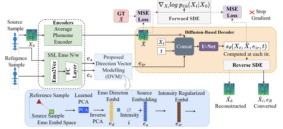 - $f(\cdot)$ : DVM function - 이를 통해 emotion intensity regularized embedding $e_{ir}$이 주어지면, learned $s_{\theta}(\mathbf{X}_{t},\bar{\mathbf{X}},t,e_{ir})$을 가지는 reverse SDE를 사용하여 average voice $\bar{\mathbf{X}}$로부터 reconstructed $\mathbf{X}_{0}$를 estimate 할 수 있음