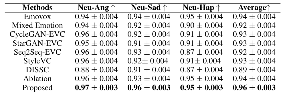 - Comparisons : EmoVox, Mixed Emotion, CycleGAN-EVC, StarGAN-EVC, StyleVC, DISSC, Seq2Seq-EVC