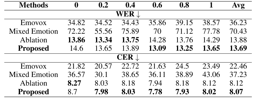 - WER, CER 측면에서도 EmoReg가 가장 뛰어난 성능을 보임