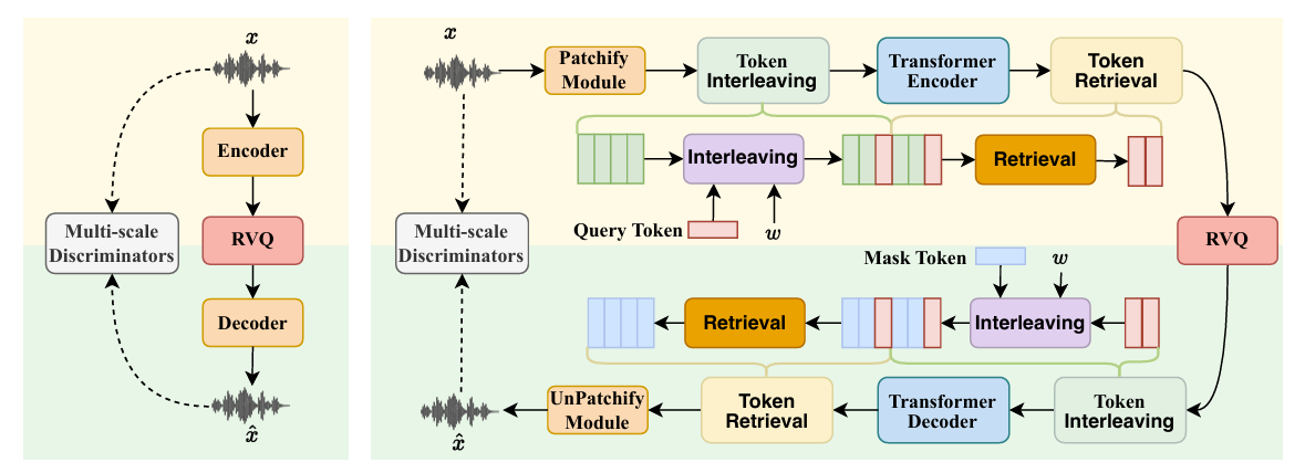 - 이때 better compression, semantic modeling을 위해 Transformer를 활용하고, query token 수를 adjust 하여 compression rate를 dynamic control 할 수 있음 - Codec의 semantic richness를 향상하기 위해 Masked AutoEncoder (MAE) loss를 활용
