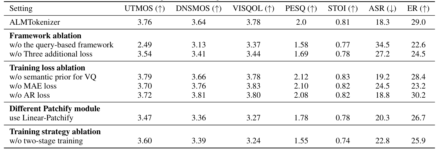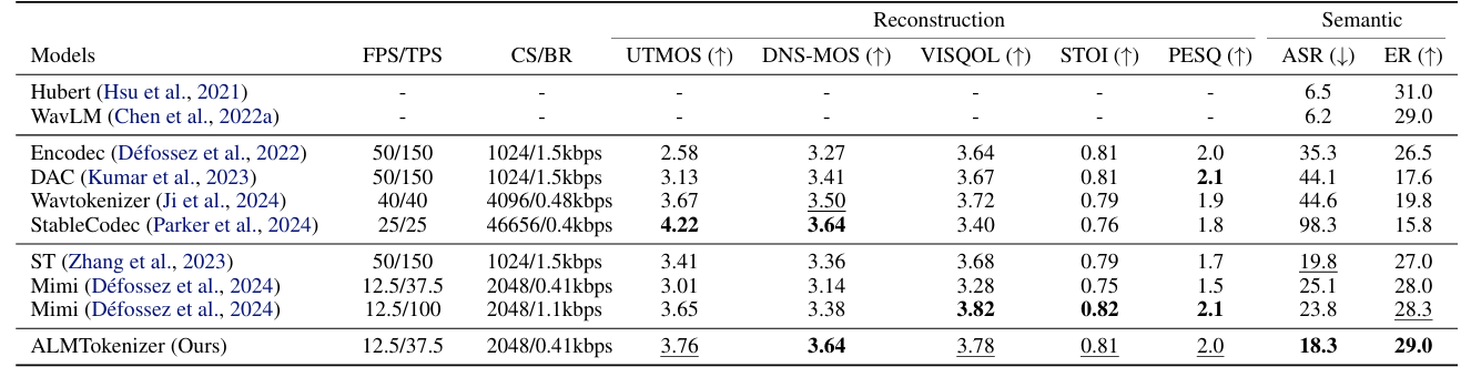 - ALMTokenizer를 사용하는 경우 LM-based TTS/ASR 성능을 향상할 수 있음
