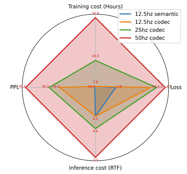 - 해당 codec은 audio data를 quantized discrete latent space에 represent하고 codec decoder는 generated discrete token sequence로부터 audio signal을 reconstruct 함 - 한편으로 어떤 type의 audio codec이 audio language modeling에 적합한지 확인하기 위해, 50Hz, 25Hz, 12.5Hz의 frame rate에서 각 audio tokenizer를 비교해 보면: