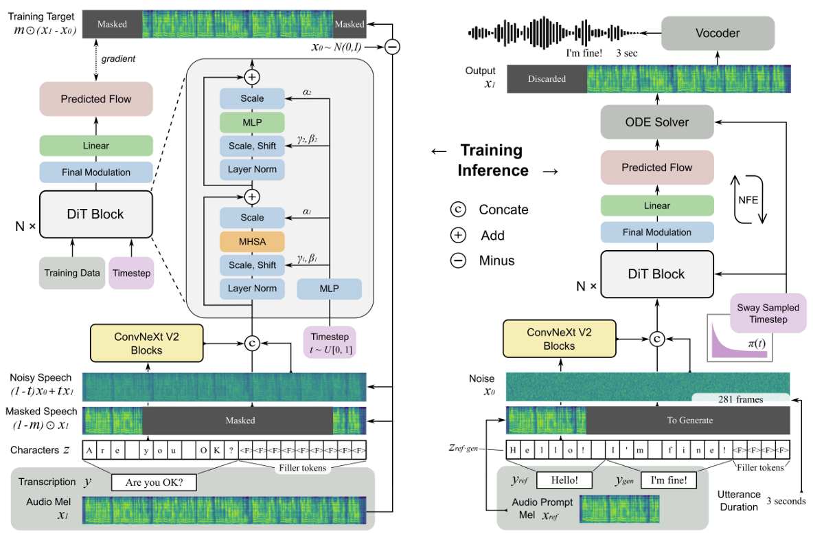 - DiT와 ConvNeXt block을 사용하여 in-context learning의 text-speech alignment를 개선