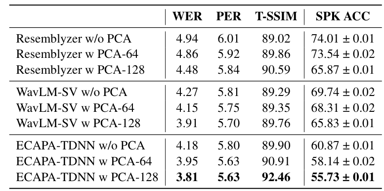 - ECAPA-TDNN에 PCA를 적용할 때 linguistic content를 가장 효과적으로 preserve 할 수 있음