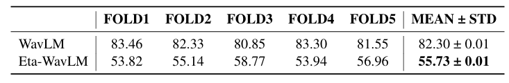 - Eta-WavLM은 WavLM 보다 우수한 classification accuracy를 달성함