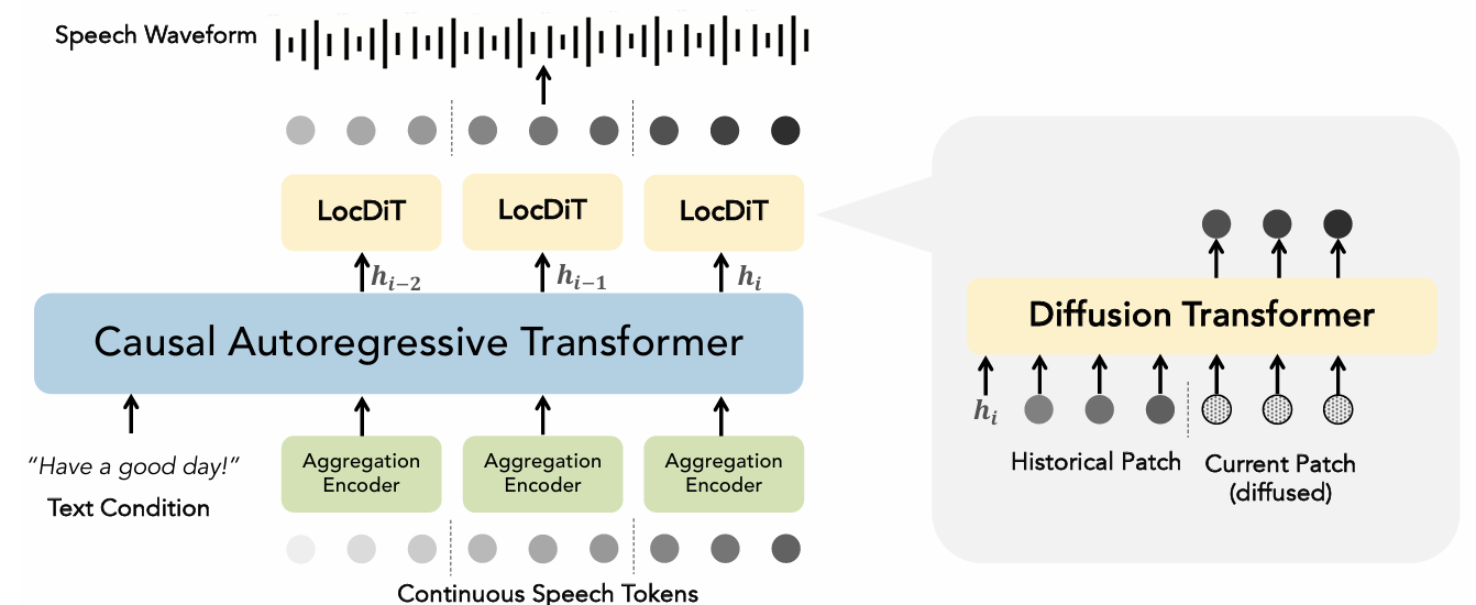 - 그런 다음 AR model에 전달되어 output embedding $h_{t}$를 생성하고, $h_{t}$는 diffusion decoder인 LocDiT의 condition으로 사용됨 - 추가적으로 논문은 training 시 output continuous token에 대한 diffusion loss를 사용함