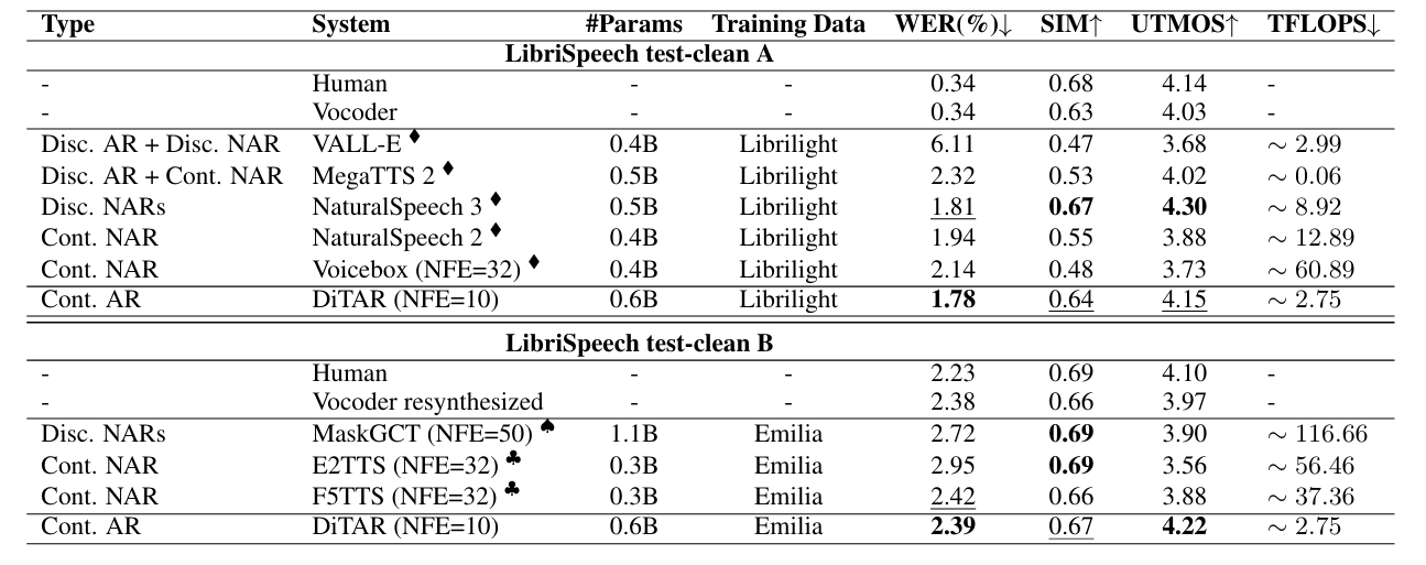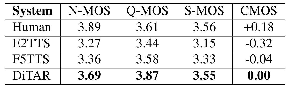 - 전체적으로 DiTAR는 뛰어난 성능을 달성함