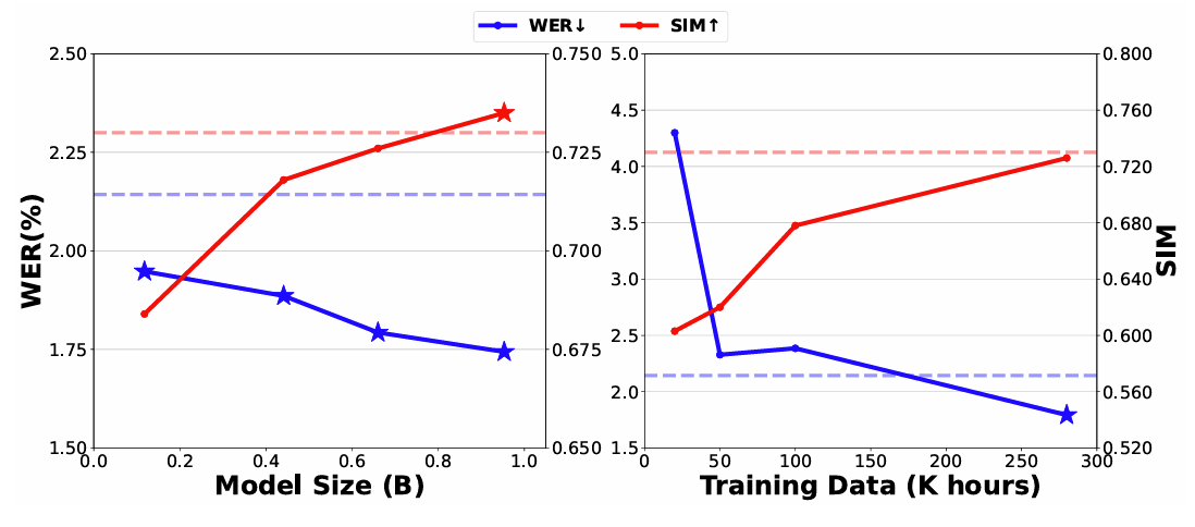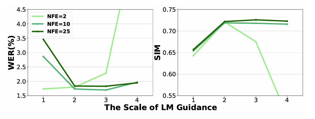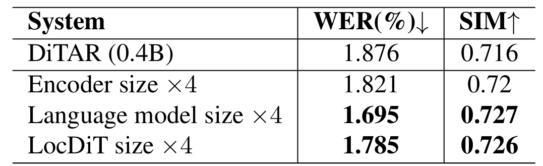 - Langauge model과 LocDiT를 enlarge 하는 것에 비해 encoder는 성능 향상에 큰 영향을 주지 않음