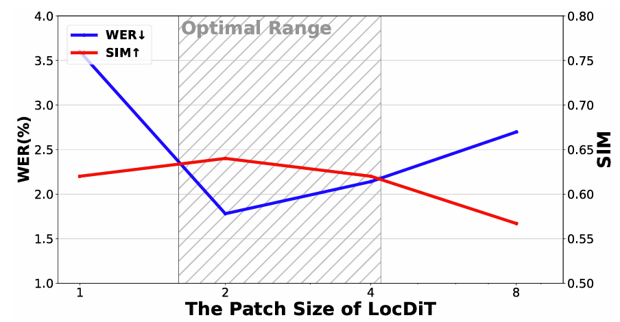 - LocDiT의 patch size가 너무 크거나 작으면 성능이 저하됨