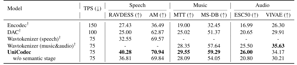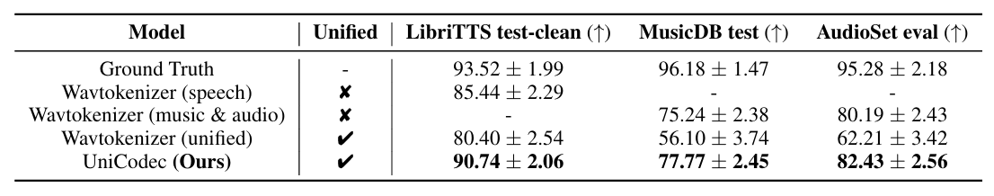 - UniCodec은 speech domain에 대해 가장 우수한 성능을 달성함