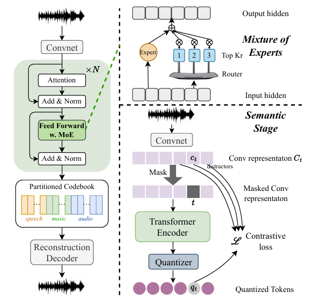 - Multiple audio domain의 data를 활용하여 codec을 training 하기 위해 논문은 Mixture-of-Experts (MoE)를 도입함