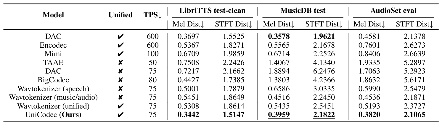 - Comparisons : DAC, EnCodec, WavTokenizer, SpeechTokenizer, Mimi, TAAE, BigCodec